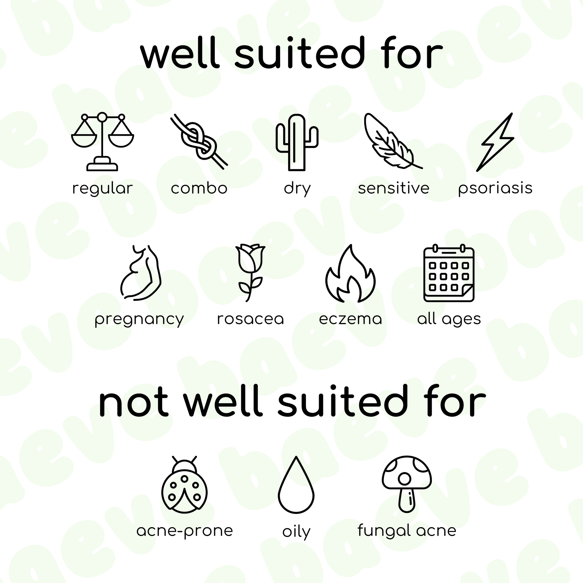 Well suited: regular, combination, dry, sensitive, psoriasis, regular, pregnancy, rosacea, eczema, all ages