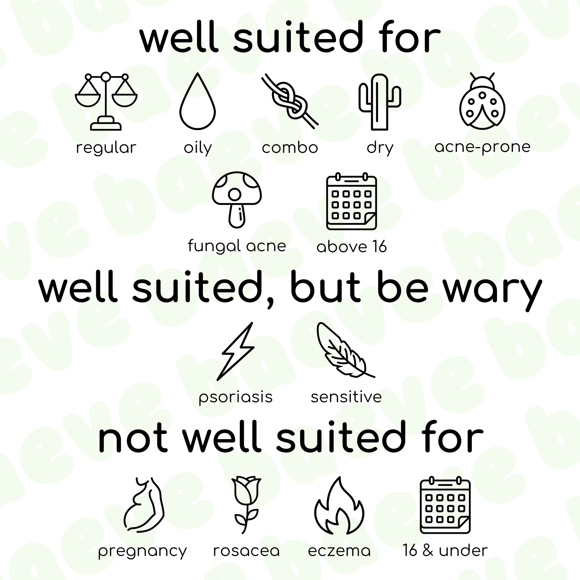 Well suited: regular, oily, combination, dry, acne-prone, everyone above 16 years of age, and those wanting to avoid fungal acne triggers
