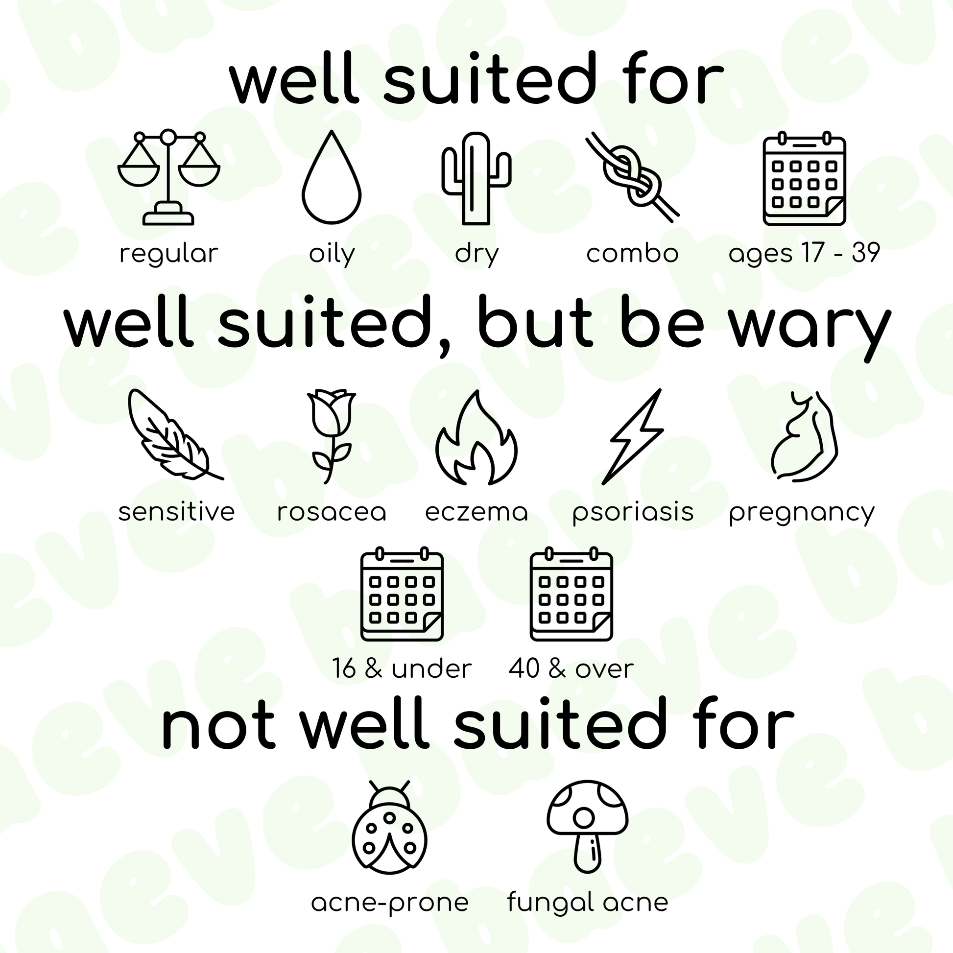 Well suited, but be wary: sensitive, rosacea, eczema, psoriasis, pregnancy, those 16 years of age and under, and those 40 years of age and over (we note that there are natural perfuming ingredients in this product, as well as essential oils - if you find that fragrance is a known irritation for you and your skin, then skip this product)