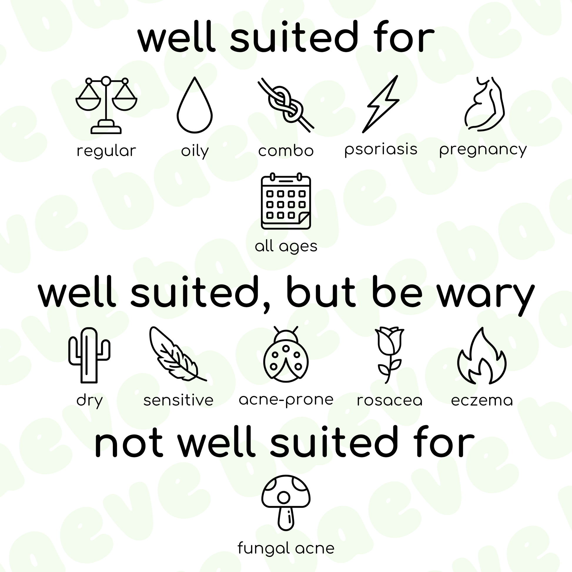 Well suited, but be wary: dry, sensitive, acne-prone, rosacea, eczema (we note that there are natural perfuming ingredients in this product, as well as essential oils - if you find that any natural fragrance is a known irritation for you and your skin, then skip this product)