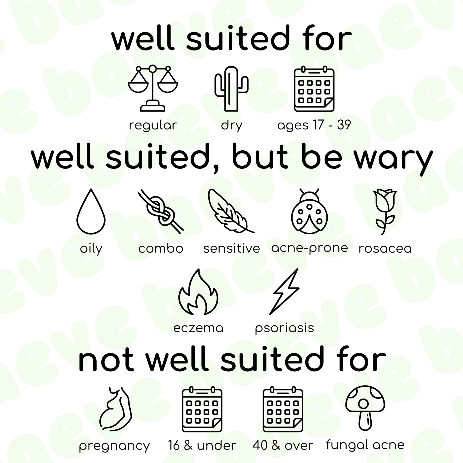 Not well suited: pregnancy, those 16 years of age and under, those 40 years old and over, those wanting to avoid fungal acne triggers