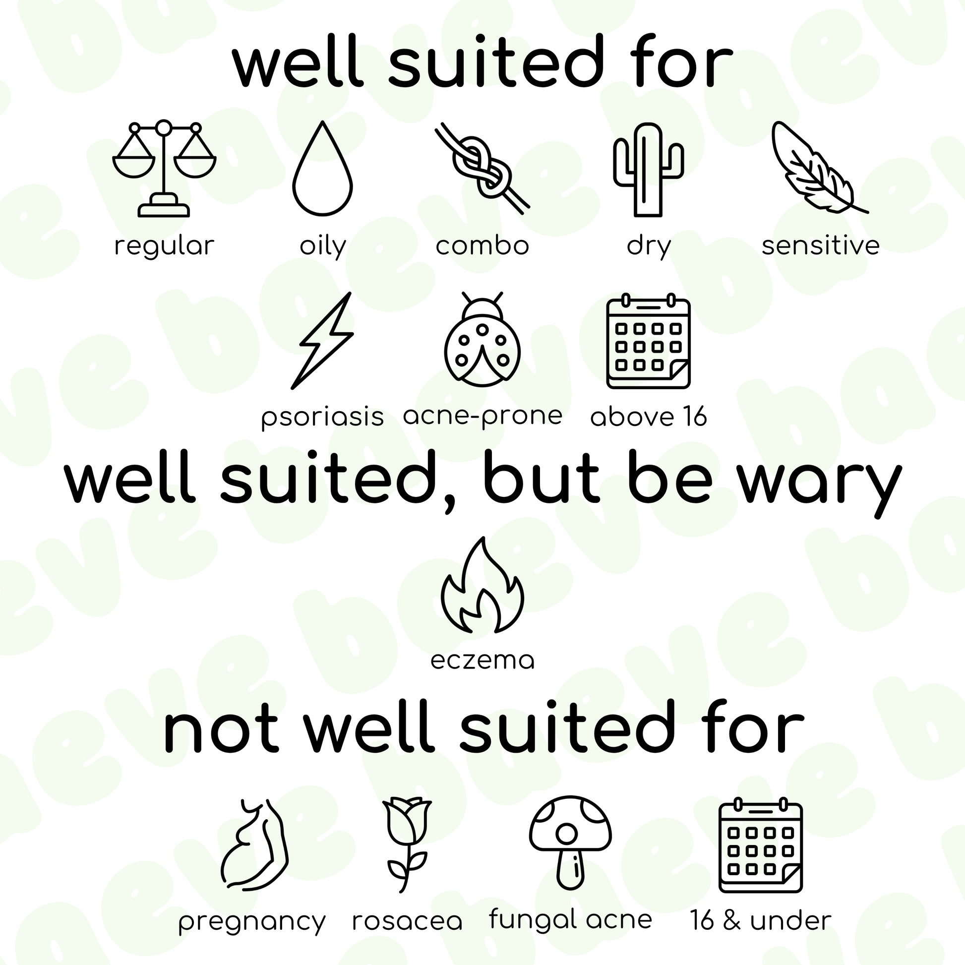 Not well suited: pregnancy, rosacea, those 16 years of age and under, and those trying to avoid fungal acne triggers
