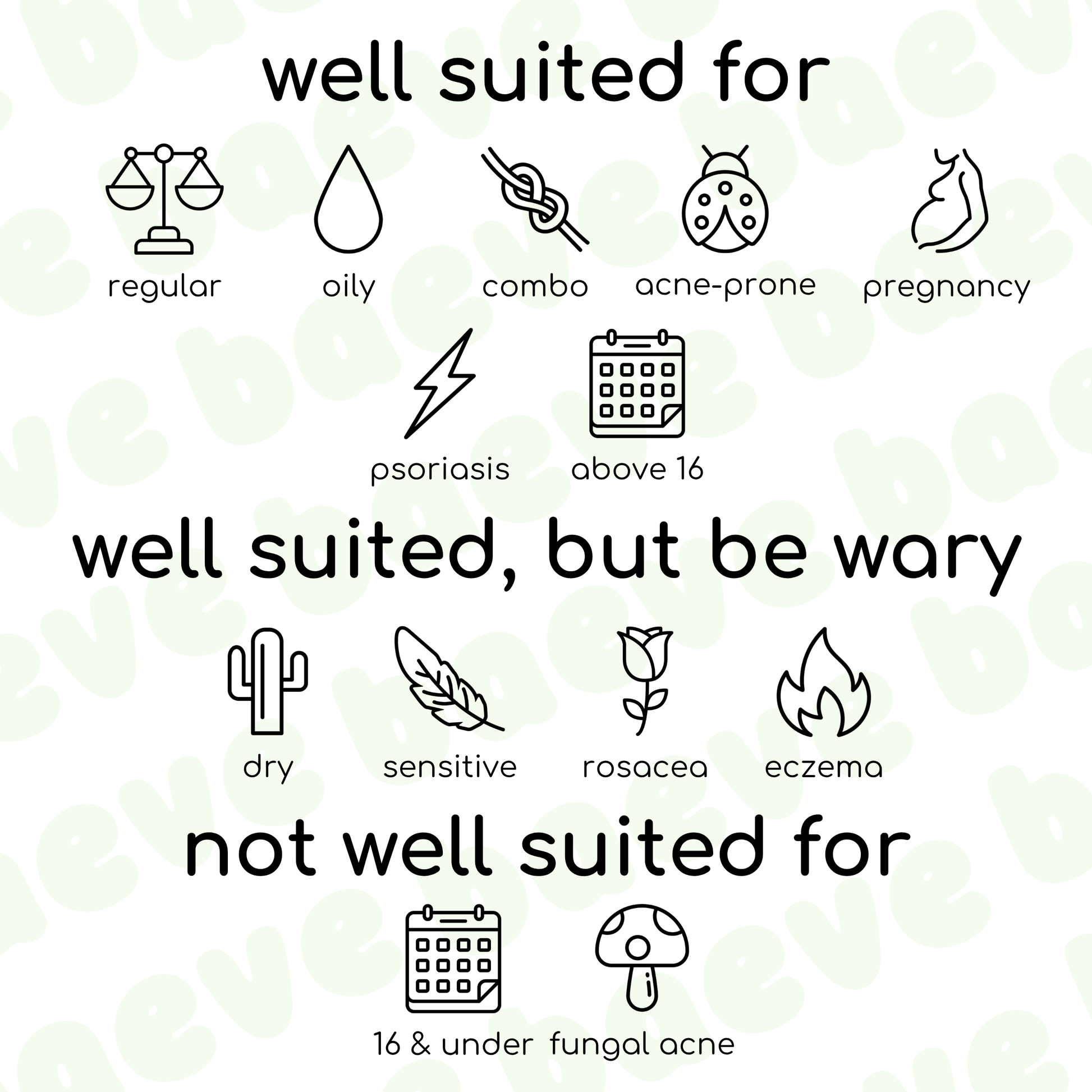 Well suited: regular, oily, combination, acne-prone, pregnancy, psoriasis, everyone above 16 years of age