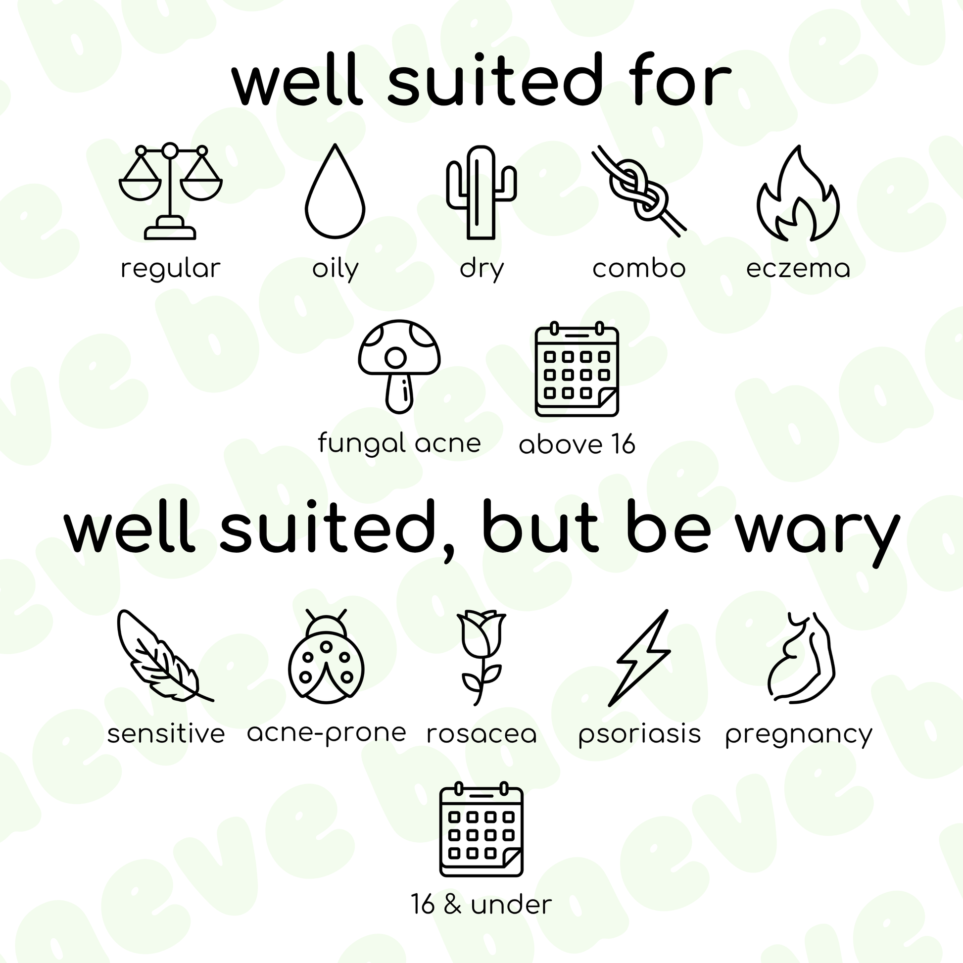 Well suited, but be wary: sensitive, acne-prone, rosacea, psoriasis, pregnancy, and those 16 years of age and under (we note that there are natural perfuming ingredients in this product, as well as essential oils - if you find that any natural fragrance is a known irritation for you and your skin, then skip this product)
