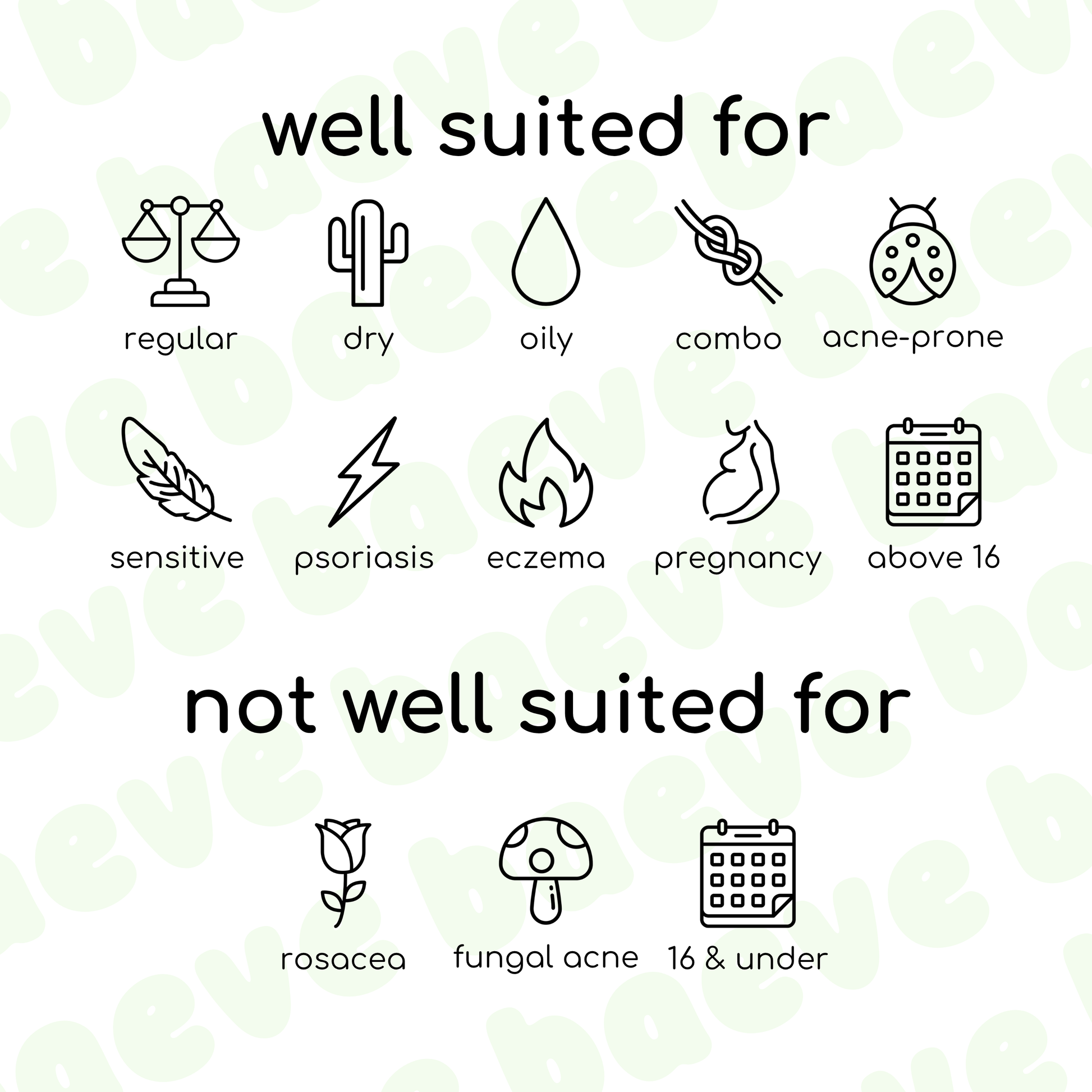 Not well suited: rosacea, those 16 years and under, and those wanting to avoid fungal acne triggers